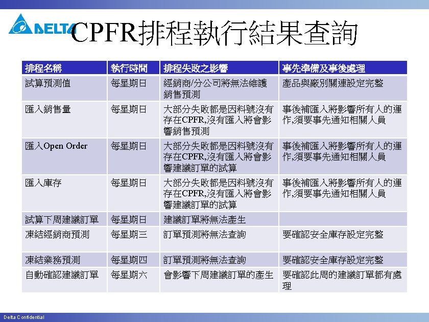 CPFR Requirement Change • CPFR Change log will keep in SDW • 如果人為的因素, 提出CPFR的資料修改, 請一律填單來處理 Delta Confidential