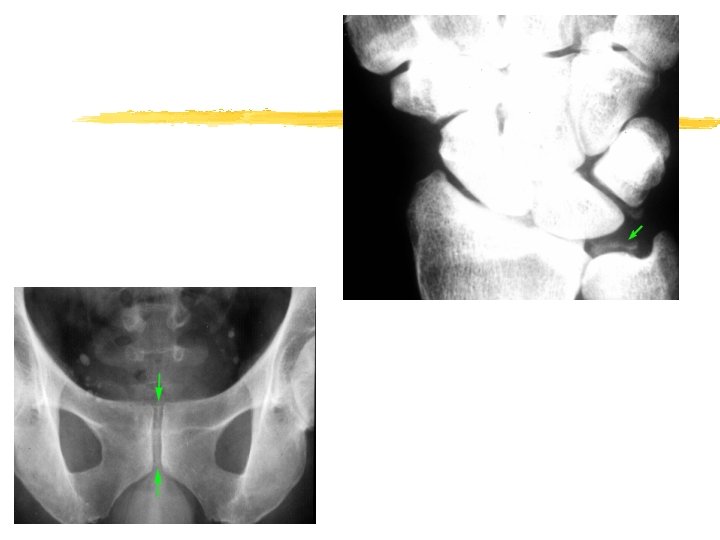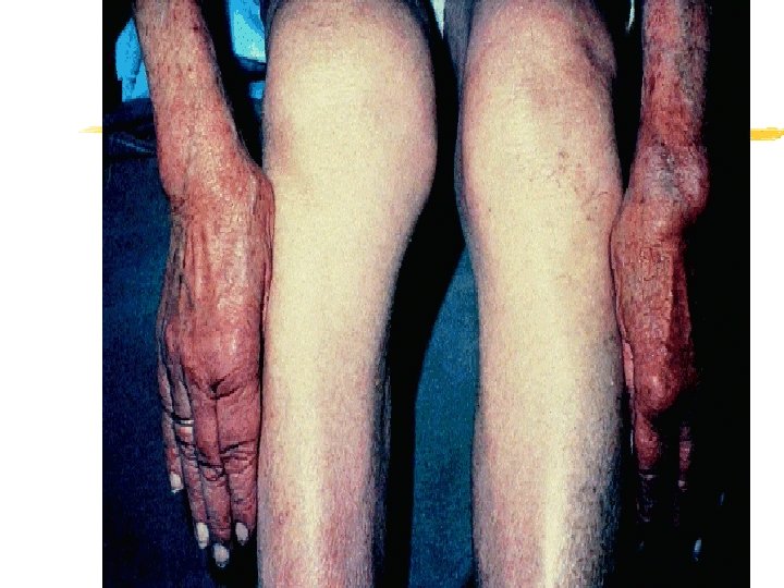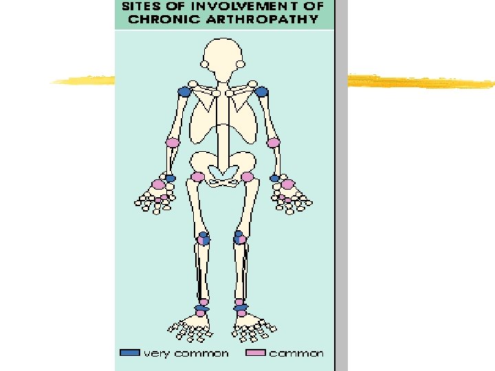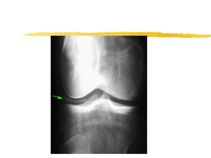 Pseudo-osteoarthritis z Pattern of joint involvement z Knee, MCP, wrist, elbow , shoulder z More likely to be symmetrical z Chondrocalcinosis