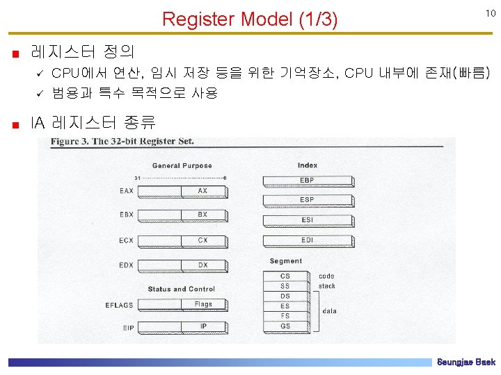 Register Model (3/3) 12 EFLAGS Register: Control and Status Flag 이 외에도 IA CPU에는 CR 0, CR 2, CR 3, IDTR, GDTR, 디버깅 레지스터, FPU 레지스터, MMX 레지스터 등 다양한 레지스터가 존재 Seungjae Baek