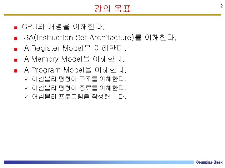 CPU (3/5) 7 Instruction Set Architecture: Register + Instructions 0 x. FF address data registers processor instructions and data memory ü ü ü Register model Memory model Instruction model 0 x 00. . 00 Seungjae Baek