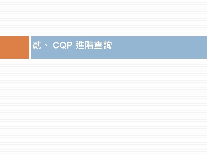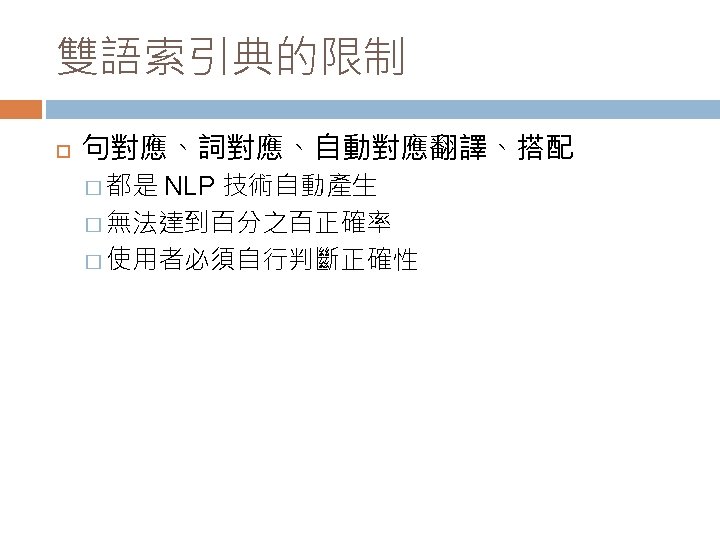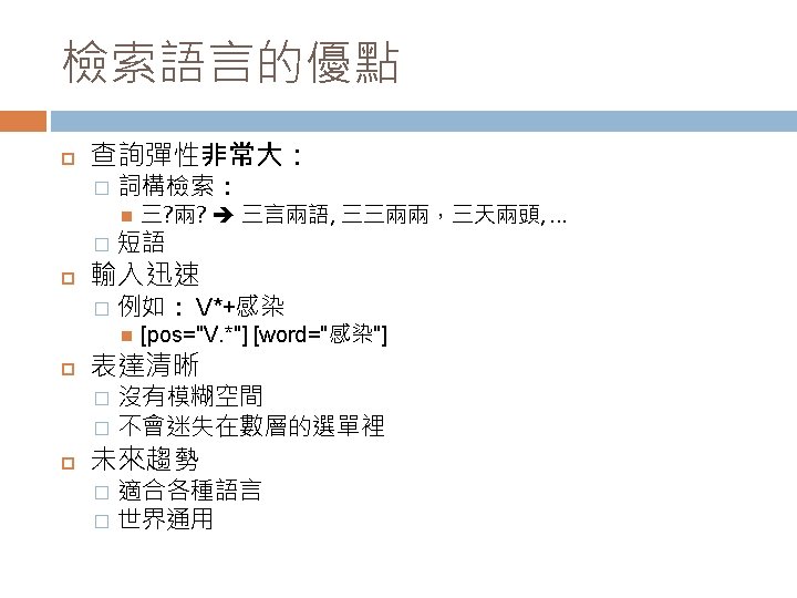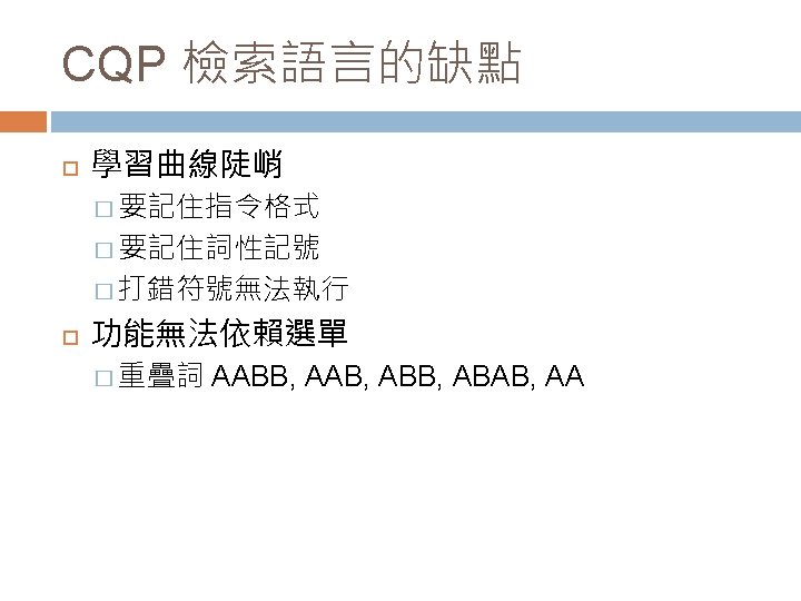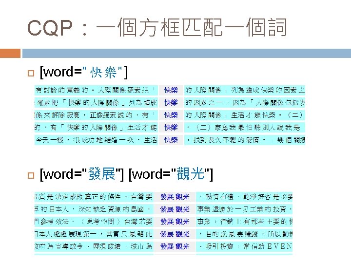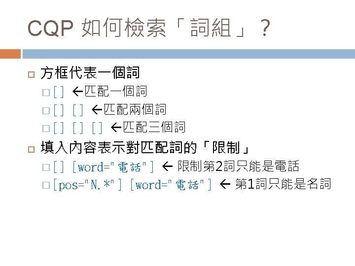 CQP: corpus query processor CWB(The IMS Open Corpus Workbench, 1990): � 德國斯圖加特大學 � 自然語言處理研究所(IMS) � 語料庫管理 具 � 語料庫查詢引擎(CQP) [word="chair. *" & pos!="N. *"]