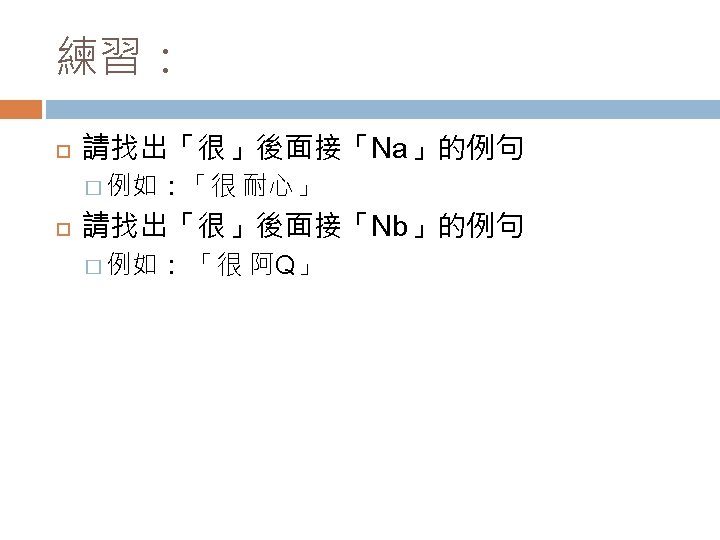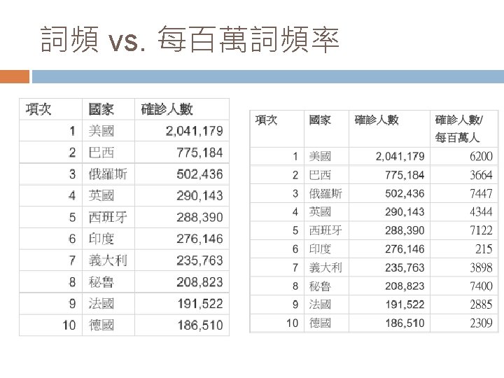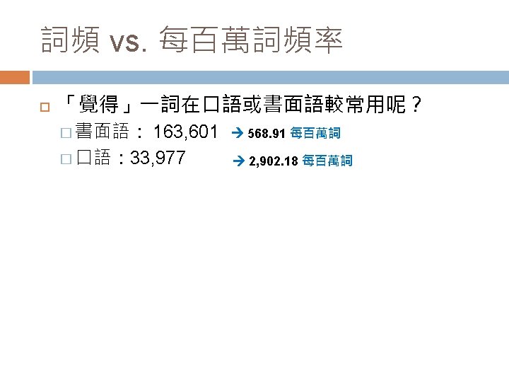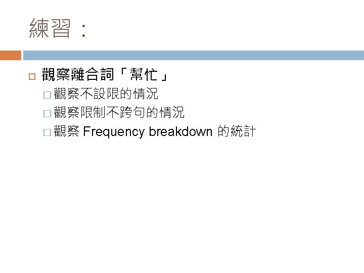 觀察結構的利器 frequency breakdown 想觀察量詞「頭」可以接那些名詞 � [word="頭"&pos="Nf"] [pos="Na"] � Frequency breakdown