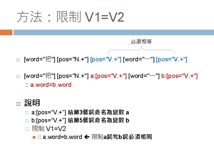 新功能 AABB, ABAB, ABB, AA � 舊方法: [word=". . " & char(word, 0)=char(word, 1) & char(word, 2)=char(word, 3)] � 新功能 [word=@AABB] [word=@ABAB] [word=@ABB]