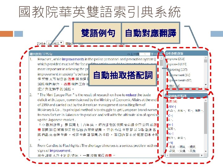 雙語索引典:輔助寫作教學 改善 自動對應翻譯 improved improving improvements better upgrading improves reduce progress 對應頻率 (269) (139) (107) (93) (57) (18) (8) (7)