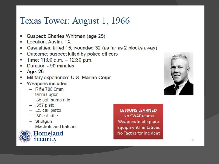 RAPID DEPLOYMENT RESPONSE The Rapid Deployment (R/D) active shooter response came out of the Columbine tragedy (1999) � Pre Columbine: establish perimeter and call SWAT � Post Columbine: engage and neutralize threat � �Theory originally out of LAPD / NTOA � Many variations on theme exist today! (run-hide-fight, A. L. I. C. E. , The Diamond)
