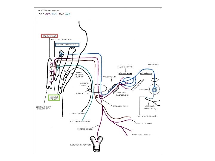 Branches § Tympanic: relays in the otic ganglion and gives secretomotor to the parotid gland § Nerve to Stylopharyngeus muscle. § Pharyngeal: to the mucosa of pharynx. § Tonsillar. § Lingual : carries sensory branches, general and special ( taste) from the posterior third of the tongue. • Sensory branches from the carotid sinus and body ( pressoreceptors and chemoreceptors).