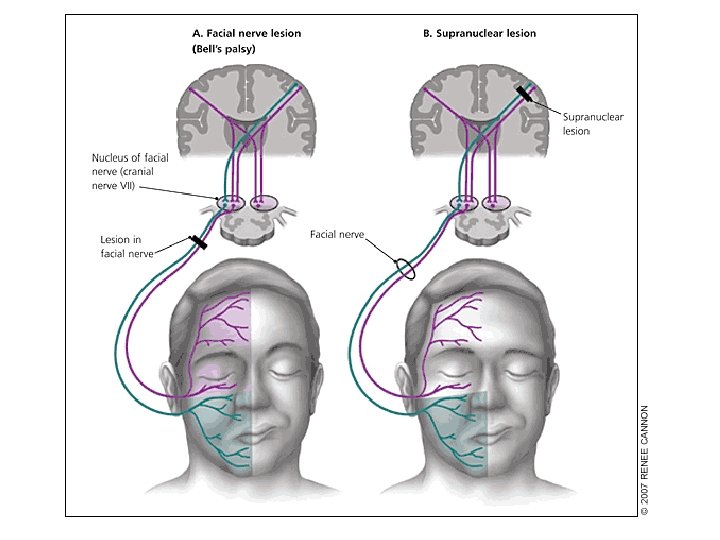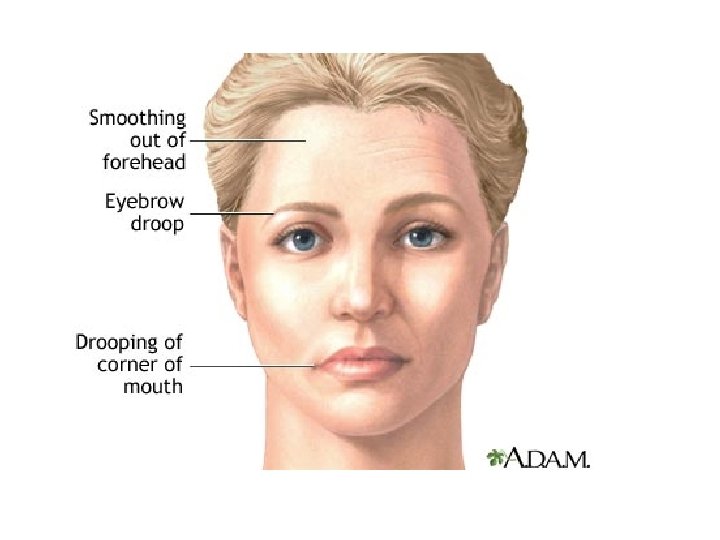 VII. Facial �UMN paralysis-Only lower face affected Stroke �LMN paralysis-All of face affected Bells Palsy