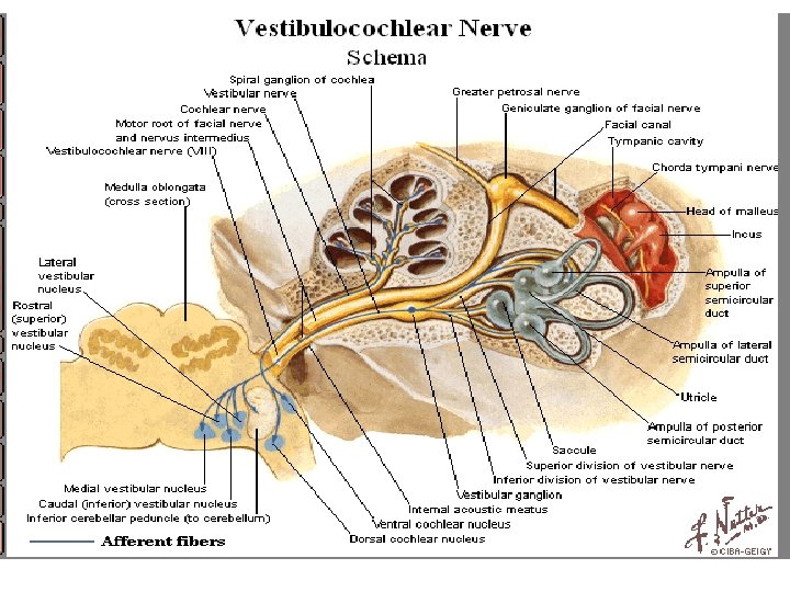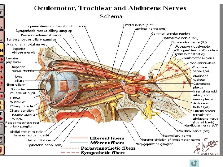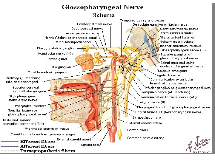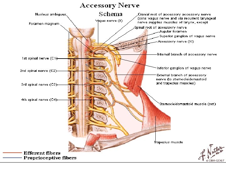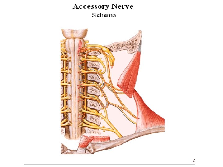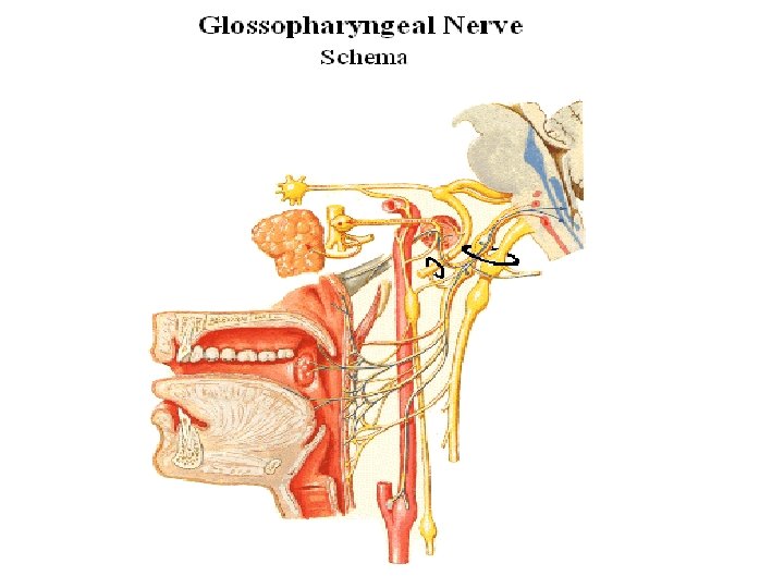 Cranial Nerves 1. Olfactory – sensory - sense of smell 2. Optic nerve – sensory – visual acuity 3. Oculomotor – eye ball movement, lid movement, pupillary constriction lens accommodation 4. Trochlear – motor – muscles that move the eye 5. Trigeminal – mixed – facial sensation, mastication 6. Abducens – motor – muscle that move the eye 7. Facial – mixed – facial expression, salivation, taste 8. Vestibilocochlear – sensory – hearing and equilibrium 9. Glossopharyngeal – mixed – taste, sensation in the pharynx and tongue, pharyngeal muscles 10. Vagus – mixed – muscles of pharynx, larynx, soft palate, thoracic and abdominal viscera – parasympathetic innervation 11. Spinal accessory – motor – sternocleidomastoid trapezius muscles. 12. Hypoglossal – motor – movement of the tongue