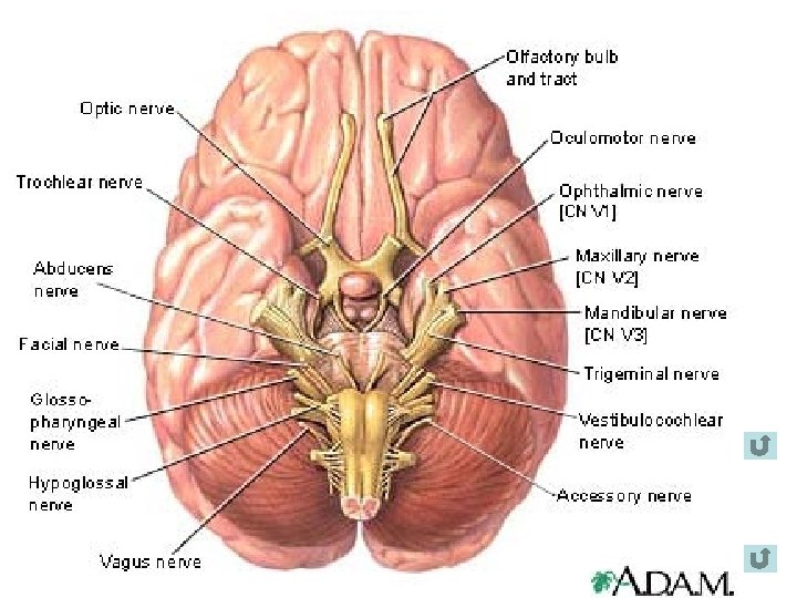 Cranial Nerves • 12 pairs • Emerge from the lower surface of the brain and pass through the foramina in the skull • I, II, VIII – sensory • III, IV , V, XI and XII – motor • V, VII, IX and X are – mixed