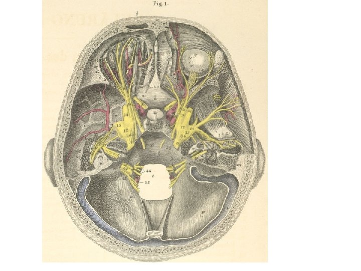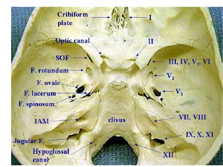 a) Frontal bone. b) Frontal sinus. c) Internal frontal spine. d) Foramen caecum. e) Crista galli. f) Frontal bone, orbital portion. g) Cellulae of the ethmoidal bone. h) Body of the sphenoid bone. i) Greater wing of the sphenoid bone. k) Occipital bone, basilar portion. l) Temporal bone, squamous portion. m) Temporal bone, petrous portion. n) Optic foramen. o) Foramen rotundum. p) Foramen ovale. q) Foramen spinosum. r) Superior orbital fissure. s) Tympanic cavity. t) Internal auditory meatus (broken open from above). u) Malleus, hammer (s. capitulum). v) Incus (s. ambos). w) Cochlea. x) Superior semicircular canal. y) Ocular bulb. z) Lacrimal gland. a) m. Lateral rectus. b) m. Levator palpebrae superioris. g) m. Superior rectus. d) m. Superior oblique. d*) Trochlea for superior oblique. e) m. Medial rectus. z) m. Temporalis (medial surface). h) m. Lateral pterygoid. q) Hypophysis (pituitary gland). i) Foramen magnum. k) Jugular foramen. l) Hypoglossal canal (s. Anterior condyloid foramen). m) Occipital bone (fossae cerebelli). n) Transverse sinus. 1. middle meningeal artery (branch of the maxillary artery). 2. internal carotid artery. 3. lacrymal artery. 4. artery, muscle branch. 5. supraorbital artery. 6. ethmoidal artery. 7. ophthalmic artery. 8. optic nerve (CN II). 9. oculomotor nerve (CN III). 10. trochlear nerve (CN IV). 11. trigeminal nerve (CN V).