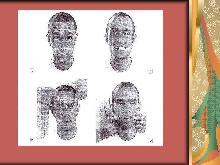Examination: Inspection: Observe the face for any asymmetry which may be related paresis of the facial muscles. Observe the symmetry of blinking and eye closure and the presence of any tics or spasms of the facial musculature. Observe spontaneous movement of the face. Particularly the upper and lower facial musculature during such actions as smiling.