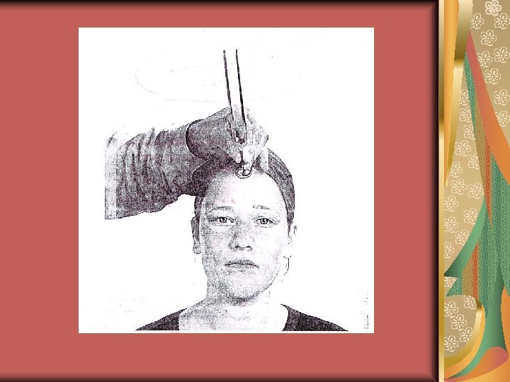 Weber's test: By placing the strongly vibrating tuning fork to the middle of forehead. Ask the where the sound is heard loudest (in the midline or preferentially to one side). Examine external acoustic canal using an auroscope. Visualize the tympanic membrane and note any abnormal vascularity of the membrane or retrotympanic fluid level.