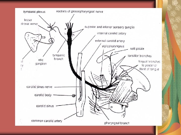 Glossopharyngeal nerve: The motor component is small and innervates the stylopharyngeus muscles. It sometimes contributes to the innervation of the palatal and upper pharyngeal muscles. The large sensory component innervates the mucosa of the pharynx and tonsillar region, conveys taste for the posterior third of the tongue and sensation for part of lining of the tympanic cavity and Eustachian tube. Secretomotor parasympathetic fibers supply the parotid gland.