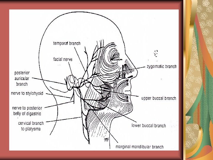 1 - Temporal branches: travel superiorly and anteriorly to supply facial muscle situated above zygomatic arch including the orbit and forehead. 2 - Zygomatic branches: travel transversely across the face to supply the muscles zygomatic, orbital and infra orbital areas. 3 - Buccal branches: supply muscle of the cheek. 4 - Marginal mandibular branches: supply muscle of the chin and lower lip 5 - Cervical branches: descends to the neck to supply the platysma muscle.