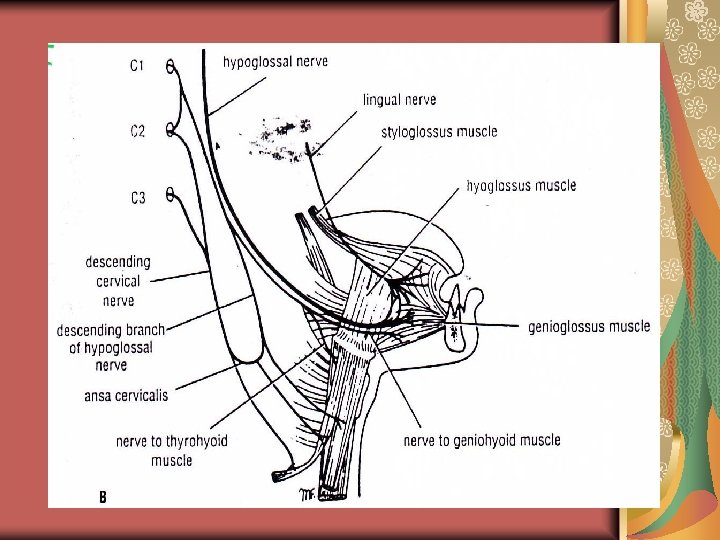 The hypoglossal ( XII ) nerve: Anatomy: The XII nerve arises from a motor nucleus located beneath the floor of the fourth ventricle. Its rootlets arise from the pre-olivary sulcus and pass anterolaterally in front of the vertebral and posterior inferior cerebellar arteries. It exits the skull base through hypoglossal canal in the occipital bone. It then passes to the root of the tongue, where it divides into branches that innervate the tongue muscles. Normal tongue movement is essential for articulation adequate chewing and the onset of swallowing.