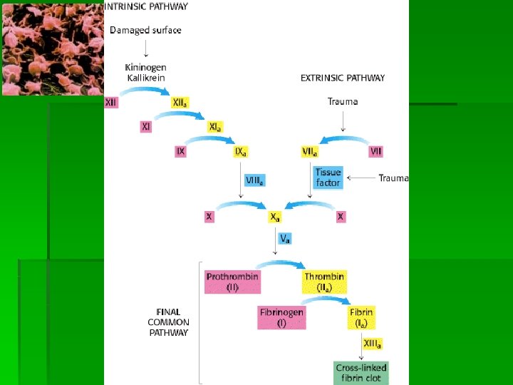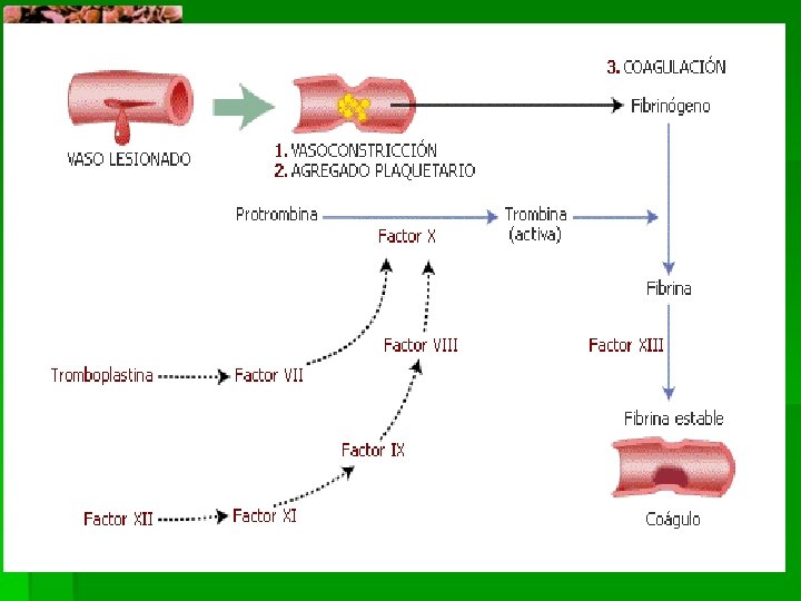 Factores de Coagulación § § § Factor I (fibrinógeno) Factor II (protrombina) Factor III (tromboplastina, factor tisular) Factor IV (calcio) Factor V (factor lábil) Factor VII (factor estable) Factor VIII (factor antihemofílico A) Factor IX ( factor Christmas, factor antihemofílico B) Factor X (factor Stuart ) Factor XI (factor antihemofílico C) Factor XII (factor Hageman) Factor XIII (factor estabilizante de la fibrina) II, VII, IX y X son dependientes de vitamina K.