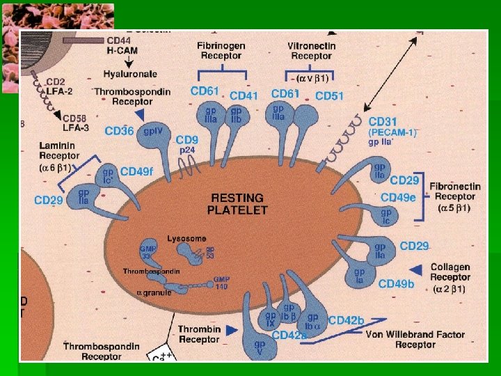 § Glucoproteínas: receptores de membrana § Microtúbulos: mantienen la forma discoide de la plaqueta § Sistema contractil: microfilamentos y protreínas contràctiles como actina, miosina, troponina y tropomiosina. § Sistema canalicular abierto: función secretora, son invaginaciones de la membrana, los gránulos se fusionan y expulsan su contenido. § Sistema tubular denso: máxima reserva de Ca ++. § Granulaciones citoplasmáticas: § gránulos densos: elevada concentración de aminas(serotonina), ADP, ATP, Ca++ § Alfa: contienen proteínas específicas y otras no específicas como Fv. W y Fno. § Lisosomas: enzimas hidrolíticas, hidrolasas ácidas.