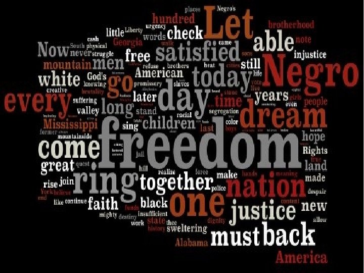 “One hundred years later” (paragraph 3) Effects on the reader Repeated phrases “Now is the time” (p 6) “We must”: (p 8) “We can never (cannot) be satisfied (p 13) “Go back to…” (p 14) “I have a dream” (p 16 -24) “With this faith” (p 26) “Let freedom ring (from)…” (p 27 -41) Use of repeated phrases in MLK’s speech