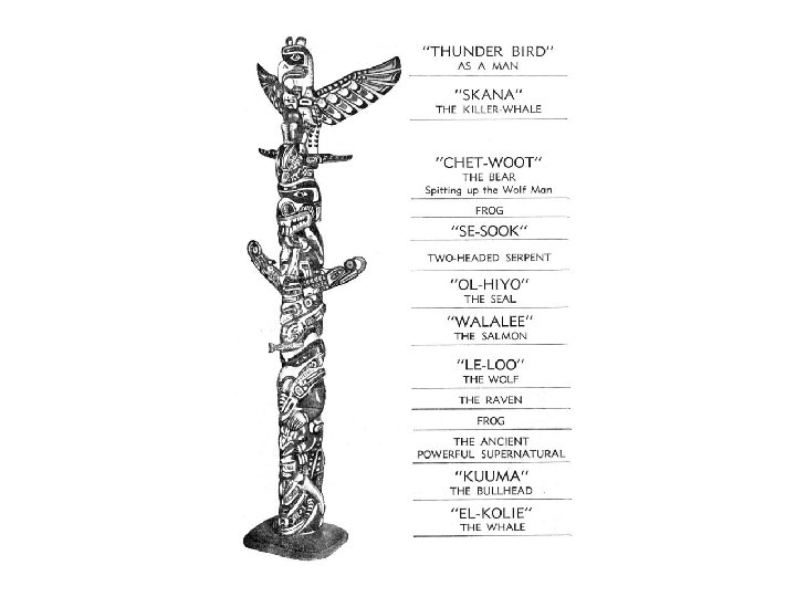 Meaning of Totem Poles • A totem pole typically features symbolic and stylized human, animal, and supernatural forms. Totem poles are primarily visual representations of kinship, depicting family crests and clan membership. – For example, some Kwakwaka’wakw families of northern Vancouver Island belonging to the Thunderbird Clan will feature a Thunderbird crest and familial legends on their poles. – Other common crests among coastal First Nations include the wolf, eagle, grizzly bear, thunderbird, killer whale, frog, raven, and salmon. – Wealthy and influential families may have more than one crest. – Totem poles can also be created to honor a particular event or important person.