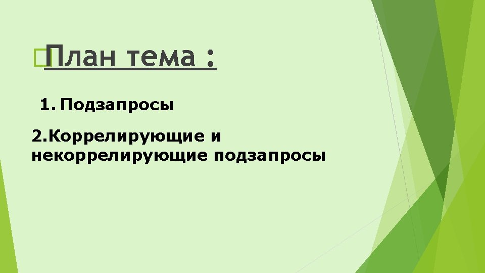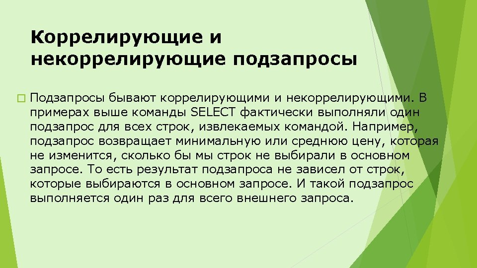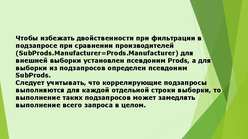 Коррелирующий подзапрос может выполняться и для той же таблицы, к которой выполняется основной запрос. Например, выберем из таблицы Products те товары, стоимость которых выше средней цены товаров для данного производителя: � SELECT Product. Name, � Manufacturer, � Price, � � (SELECT AVG(Price) FROM Products AS Sub. Prods WHERE Sub. Prods. Manufacturer=Prods. Manufacturer) � FROM Products AS Prods � WHERE Price > � � (SELECT AVG(Price) FROM Products AS Sub. Prods WHERE Sub. Prods. Manufacturer=Prods. Manufacturer) AS Avg. Price