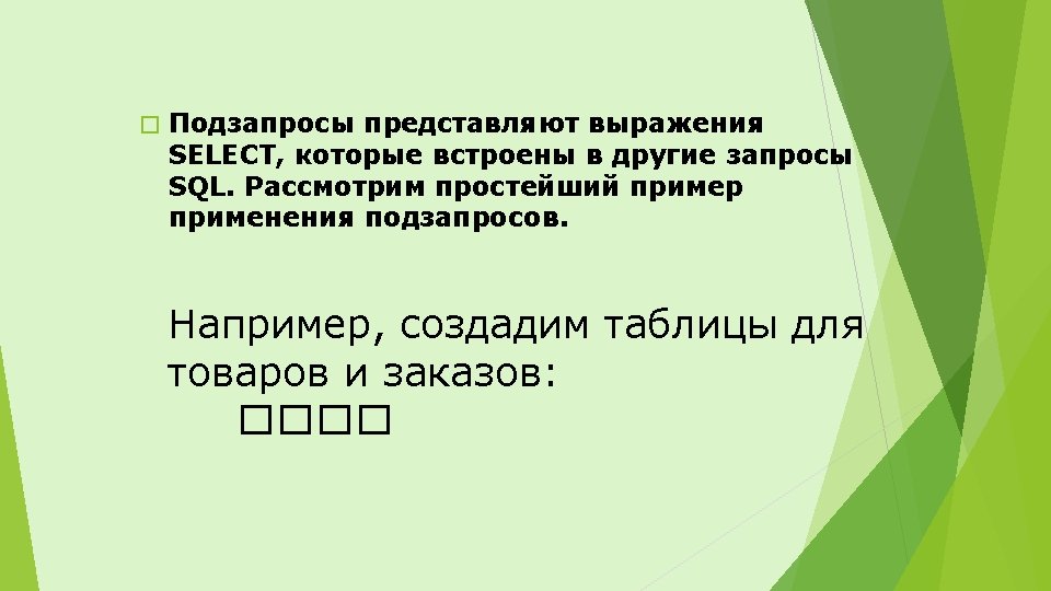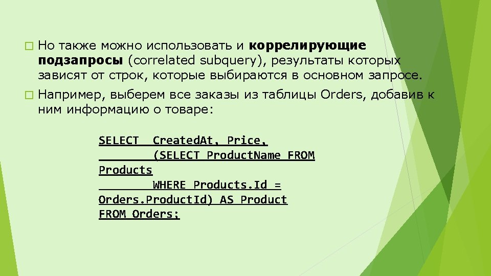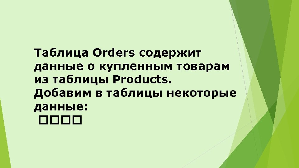 � ( (SELECT Id FROM Products WHERE Product. Name='i. Phone � X'), � '2018 -05 -23', � 1, � (SELECT Price FROM Products WHERE Product. Name='i. Phone X') � ), � ( (SELECT Id FROM Products WHERE Product. Name='i. Phone � 8'), � � � 8') � ); При добавлении данных в таблицу Orders '2018 -05 -21', как раз используются подзапросы. 1, Например, первый был сделан на (SELECT Price FROM Products заказ WHERE Product. Name='i. Phone товар Galaxy S 8.