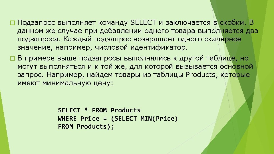 Или найдем товары, цена которых выше средней: SELECT * FROM Products WHERE Price > (SELECT AVG(Price) FROM Products);