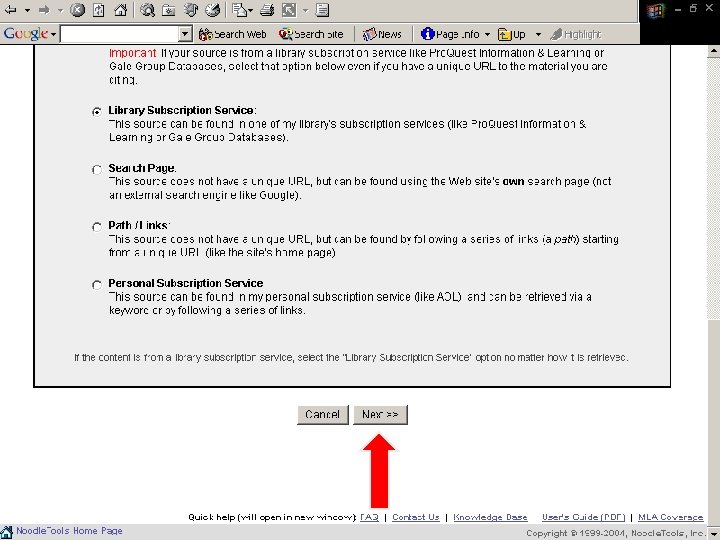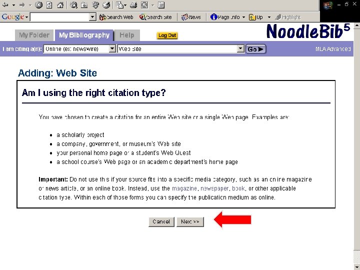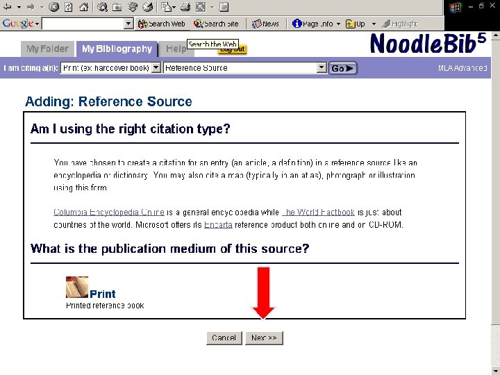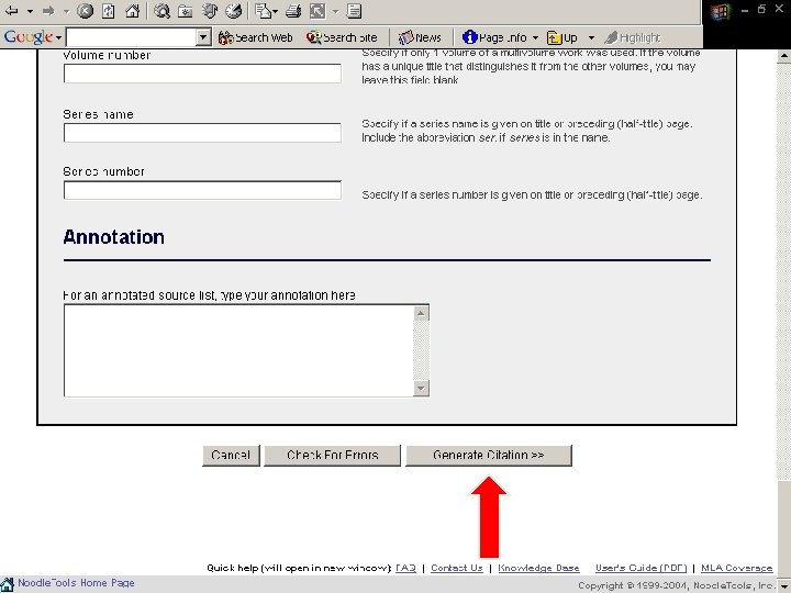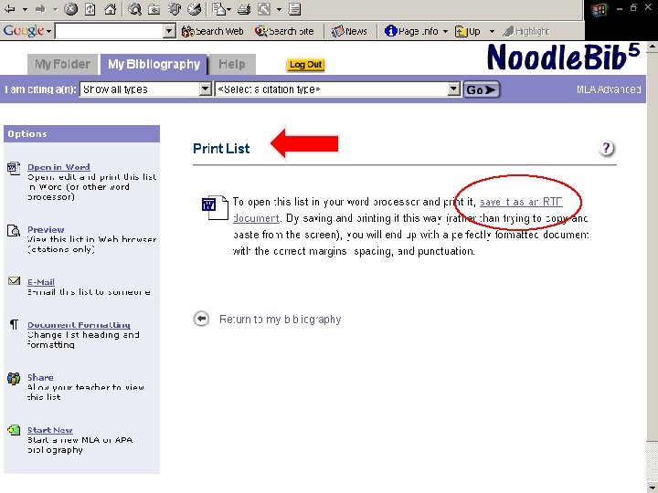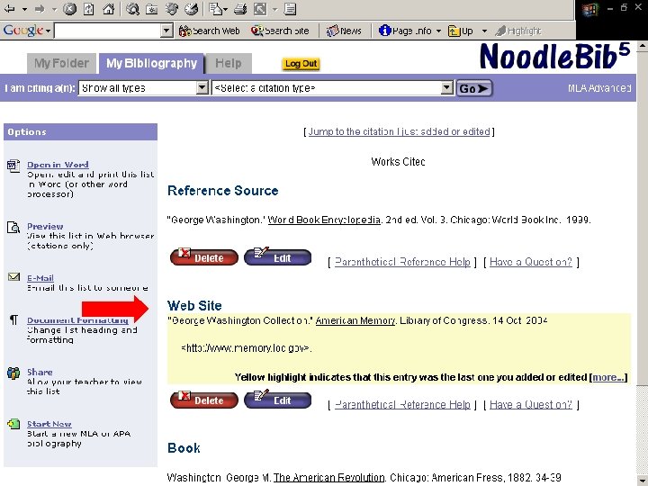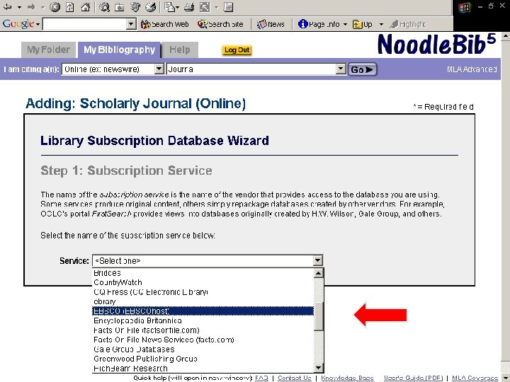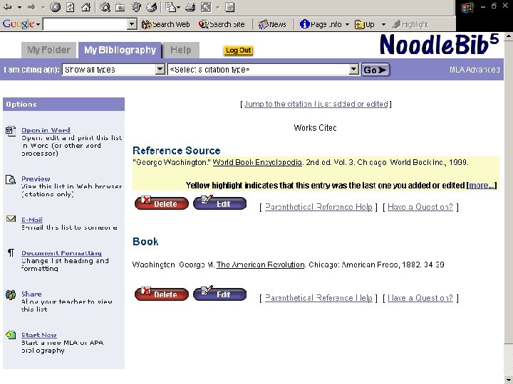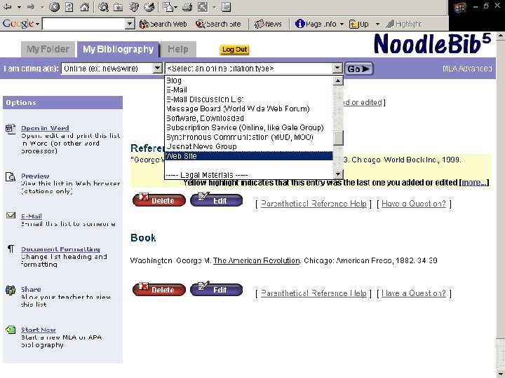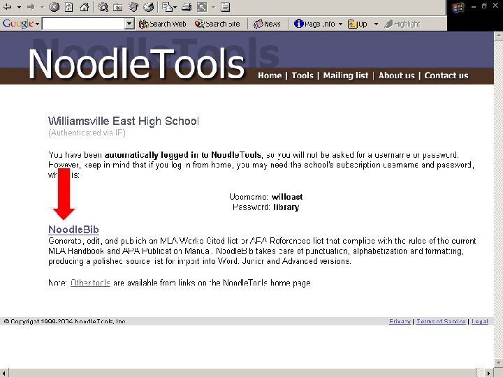 Noodle. Tools ¨ Bibliography generator ¨ Compiles works cited into alphabetical listing ¨ Transfers information to a “Works Cited” Microsoft Word file