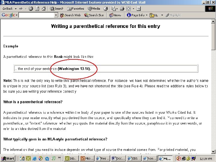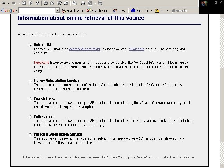 Web sites ¨ Information retrieved off the Internet ¨ Need to know: – Organization who publishes the site – URL of the site – Date you retrieved the information ¨ Note: The person who maintains the site is not necessarily the author ¨ Also, Web site information is not the same as an article retrieved from a database.
