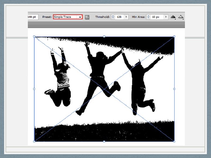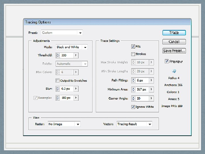 Picture on Next Slide • Open up the Tracing Options again to tweak the trace. Increase the Threshold to 200 to remove the white areas on the girl. I have also increased the blur to 0. 2 px to smooth the edges. Also check Ignore White to remove the white background from the trace. Experiment with other settings to see which settings give the best results. • Again, Tracing Options is found in the Square Box before it says Threshold.