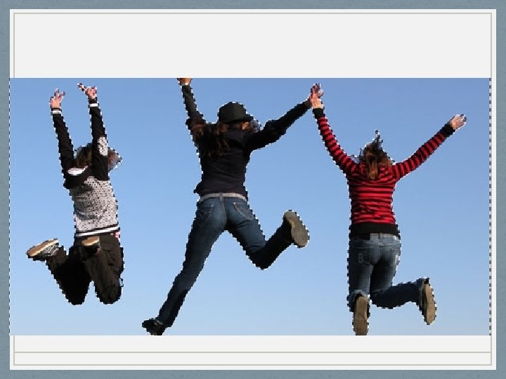 • Find the quick selection tool. It’s the 4 th tool down on the tools palette. • You may now change your brush size. Click in the area surrounding the jumping people until it has lines all around it like this. • Please note- it won’t be perfect your first time. You will need to zoom in, and use the quick selection tool that way. You can make your brush size smaller now as well, until it’s perfect. • VERY IMPORTANT: It will be tricky around the hands. If you hold option while using the Quick Selection Tool, you can click on the hands and have them rejoin the arms. You’ll be able to tell by the dashing lines around the body… like in the photo in the next slide.
