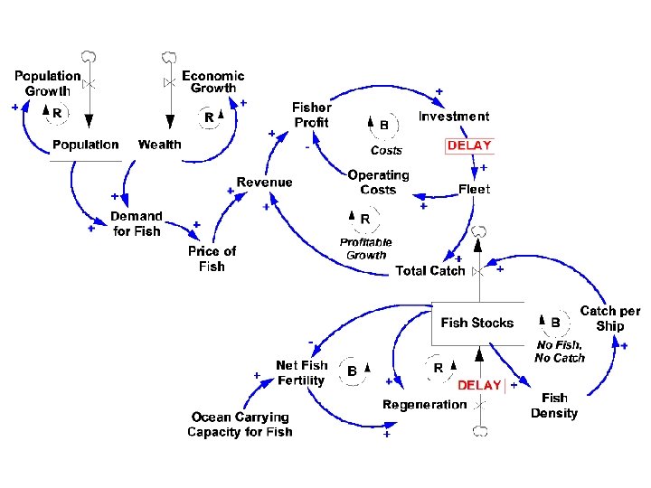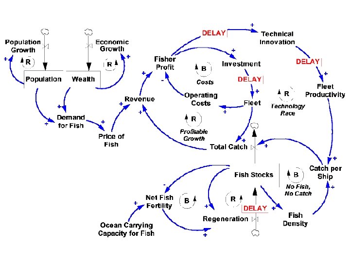 Causes of Overshoot • Market failures Externalities Common Pool Resource (Tragedy of the Commons) • Long Delays in Changes in Resource level Measuring resource level Understanding causes Recommending action Implementing policies Policy impact (Physical/Biological delay) (Perception delay) (Research delay) (Political/social delay) (Physical/Biological delay) Note: Delays are partly physical and partly political and social. Those with vested interests in the status quo often misrepresent the situation to delay action (e. g. tobacco, lead in gasoline, toxics in food, climate change).