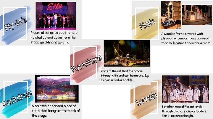 Lesson 3 - Task 1 - Understanding Set Design In Theatre Set design is an important part of almost any theatre production, as almost every show will utilize some sort of set, however minimal. Sets can be abstract, highly realistic, or anything in between, and they are a chance for a designer to showcase interesting concepts, new techniques, and unusual materials. The primary function of a set, of course, is to provide the audience with some context for the play, but it can also be a chance to create something stunning to draw in the audience. TASK - Read through the ‘Set Design Glossary’ on the next slide and either make a mind map or make notes in your own format summarising all of the Set Design elements.