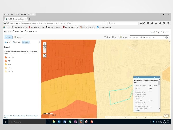 Completing Worksheet 1 • Go to http: //ct. gov/doh • Click on “Policy and Research” and then scroll down to “Connecticut Opportunity Map” • • • Open the Connecticut Opportunity Map Click on “Content” Check off “Population--% Non-White” • Put address of the housing complex into the search bar on the right hand side of the map