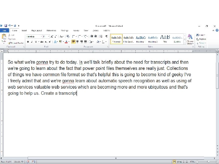 Once ASR has run: • We have the transcription of our narrated power point slide. • If you have 20 narrated powerpoint slides, there are 20. wav files. • You need to do 20 ASR processes. • And then, you have the full transcript.