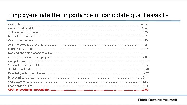 Pew Research Center --- American Trends Panel, 10/14 N= 3. 154 The Skills to Succeed: “Regardless of whether or not you think these skills are good to have, which ones do you think are most important for children to get ahead in the world today. ” • • • Communication Reading Math Teamwork Writing Logic Science Athletic Skills Music Art 90% 86% 79% 77% 76% 74% 58% 25% 24% 23%
