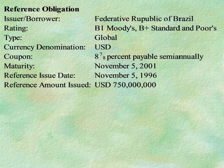 Example One-year credit-linked note issued by a credit card company • promises to pay $1, 000 and an 8% coupon if the index of credit delinquency rate is below 5%; • if index > 5%, then coupon rate falls to 4%. A credit option is embedded: right to lower the interest payments if delinquency rate increases.