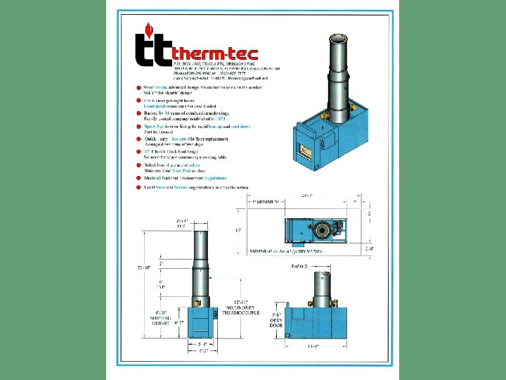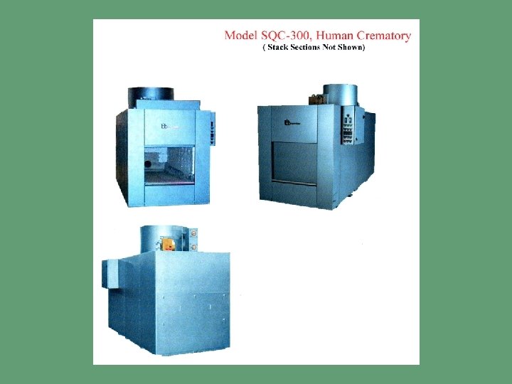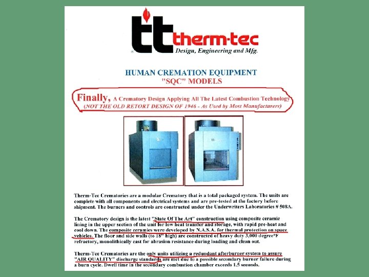 MO DNR (continued) • B) Manufacturer’s rated capacity (burn rate) shall be 200 Lbs. /hour or less – (Most crematories operate at ½ that) • C) The incinerator shall be a dual-chamber design – (All crematories are) • D) Burners shall be located in each chamber…necessary to maintain minimum temperature – (All crematories do)
