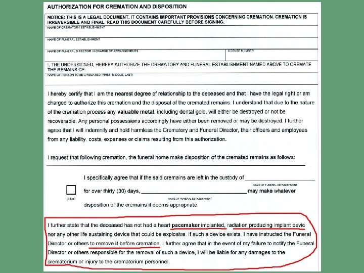 Harmful Implants and Radionucleotides • Pacemakers (after specific authorization from the next of kin) must be removed – Some older model batteries pose a threat of explosion • Radiation producing implants (used in Cancer treatment) must also be removed with family permission and passed on to our bio-hazardous waste (OSHA mandated) disposer. Our current disposer is Steri-Cycle
