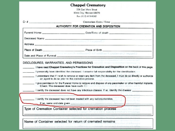Radionucleotides • Most cremation authorizations ask the next of kin to “certify the deceased has not been treated with any radionucleotides” • Parker Mortuary’s authorization also will.