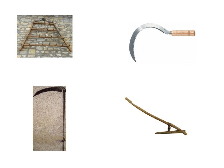 1. Les Outils • L’araire: C’est une charrue de bois sans roues. Elle creuse des sillons sans retourner la terre. • La faux: C’est un outil en métal utilisé pour couper le foin. • La faucille: Elle sert pour les moissons et les herbes. • La herse: En bois puis en métal , tirée par un cheval elle sert à préparer le sol pour