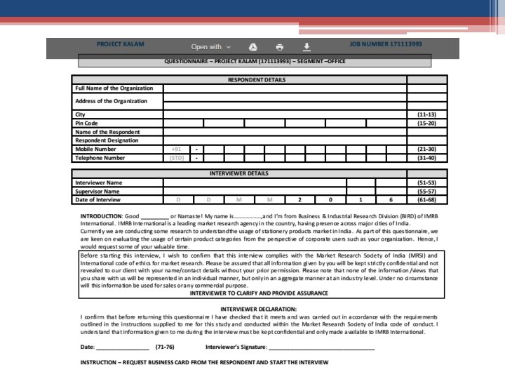 Did you notice, we kept the English text as it is and just translated below! This is what is required, some general rules • Please put all translated text alongside the English text, please do not delete or overwrite the English text. Your responsibility would include translating and setting the language script below the English script below each question. • You will read the English text, understand what is written and frame it in Hindi ( or your assigned language) and Translate (type), so that it makes sense when we read the translation. But you will in the bargain also not SKIP; DELETE any data, even if you find it irrelevant. • The translation should be of satisfactory quality. It should not be word to word as that would make no sense. The meaning and message should be conveyed properly (colloquial). These questionnaires go to the common man to be filled up, so let them be in the easiest language possible. • Please do not SKIP any data, even if you find it unreasonable or unwanted. The basic aim of our work is to get the English Text translated on PAPER, so try your level best to include everything.