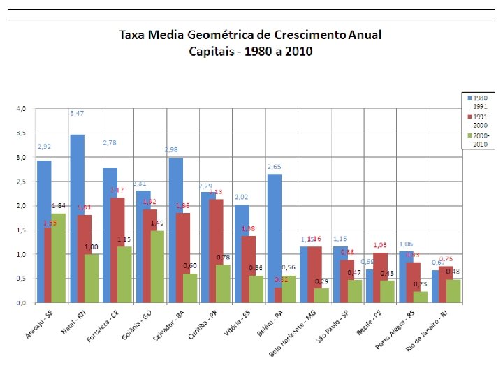 Taxa média geométrica de crescimento anual (TGCA) da população ou incremento médio anual da população medido pela expressão = [(n√P(t+n)/P(t))– 1] x 100 Onde: n = o intervalo entre as datas, pode ser o número de anos no período por ex. entre 1991 e 2000 = 9; entre 2000 e 2005 = 5 P(t) = população inicial (começo do período), por ex. , TGCA da população entre 1991 e 2000, P(t) = população de 1991 P(t+n) = população final (fim do período), por ex. , TGCA da população entre 1991 e 2000, P(t+n) = população de 2000