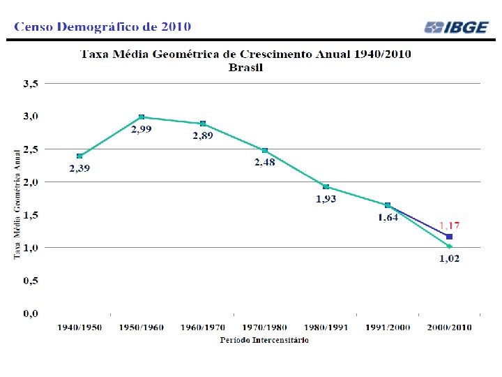 Censo 2010 - No plano nacional já se esperava uma redução marcante do ritmo de crescimento, em função das previsões de queda da fecundidade. Entretanto, esta queda surpreendeu pela sua velocidade, e pelo fato de ter atingido todas as regiões brasileiras