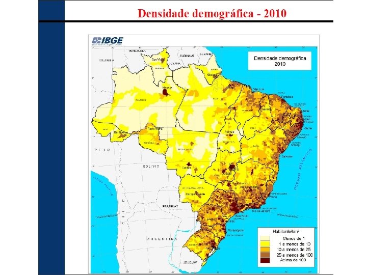 Densidade populacional de alguns países (anos próximos a 2010) • • • Austrália = 3 hab/km 2 Canadá = 3 hab/km 2 Argentina = 15 hab/km 2 Uruguai = 19 hab/km 2 Estados Unidos = 32 hab/km 2 México = 53 hab/km 2 Dinamarca = 129 hab/km 2, Japão = 338 hab/km 2, Coréia = 485 hab/km 2, Singapura = 7. 130 hab/km 2 Hong Kong = 6. 402 hab/ km 2 Itália = 201 hab/ km 2 Brasil: 22, 4 hab. /km 2