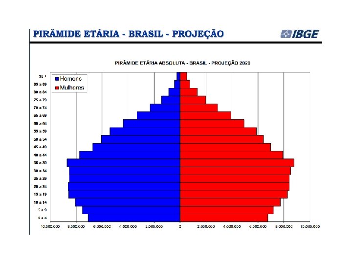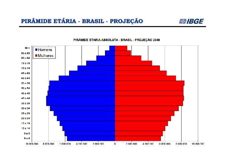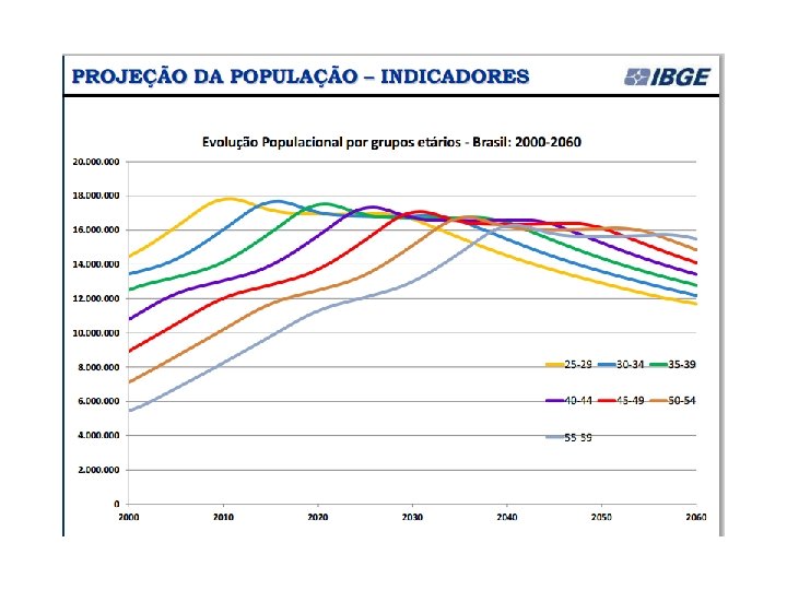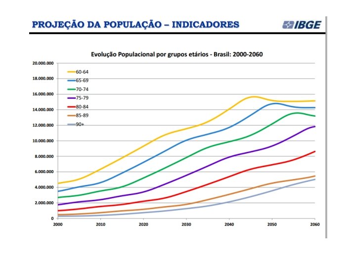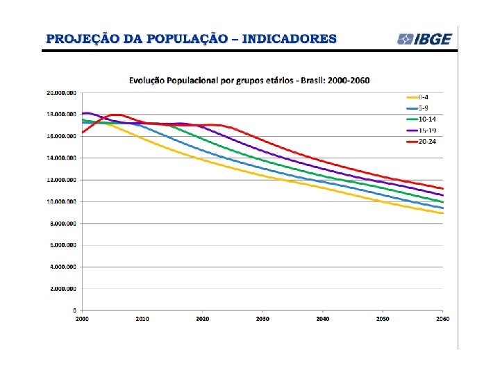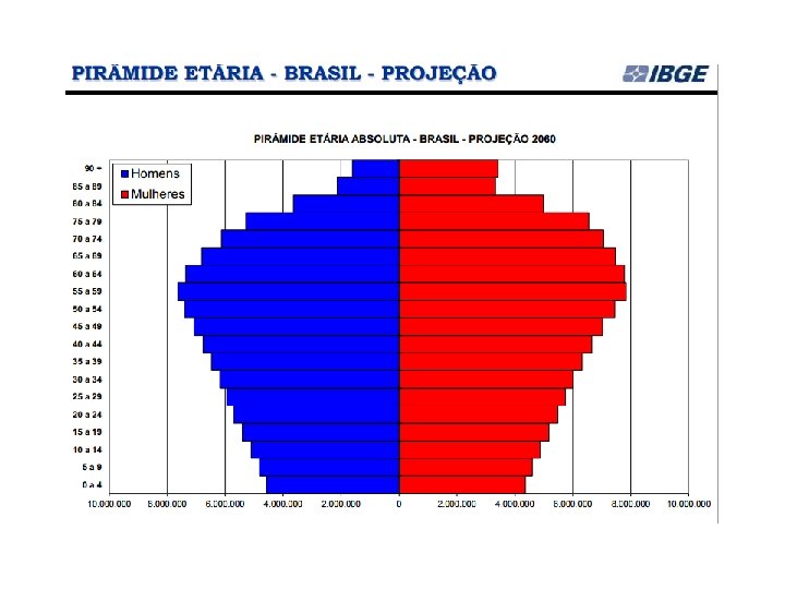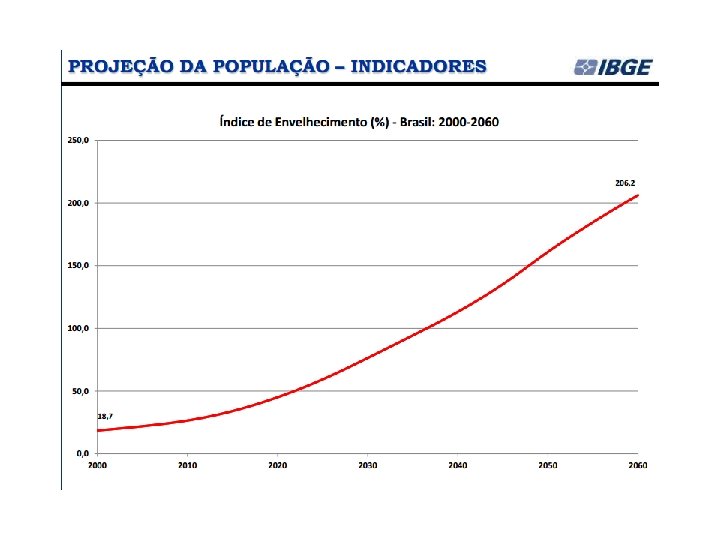 Desde 1973, o IBGE elabora as projeções populacionais para o total do País pelo método das componentes demográficas. Na mais recente projeção (Projeção da população por sexo e idade: Brasil 2000 -2060), o IBGE divulgou que: A população brasileira continuará crescendo até 2042, quando deverá chegar a 228, 4 milhões de pessoas. A partir do ano seguinte, ela diminuirá gradualmente e estará em torno de 218, 2 milhões em 2060. (IBGE, ago/2013)