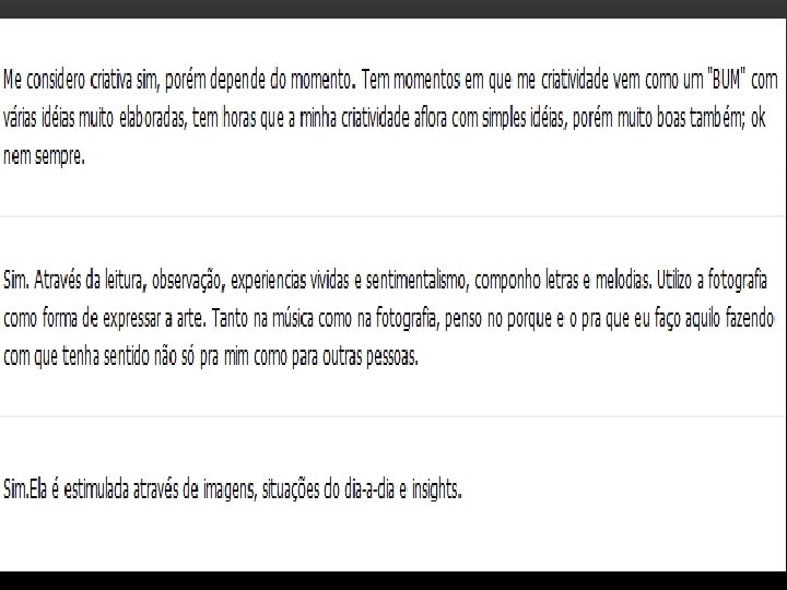 É COMUM OUVIRMOS AS PESSOAS DIZEREM QUE NÃO TÊM CRIATIVIDADE. ISSO NÃO É VERDADE. APENAS EM ALGUMAS PESSOAS ELA ESTÁ MAIS AFLORADA DO QUE EM OUTRAS. TODOS NÓS NASCEMOS COM CRIATIVIDADE, A DIFERENÇA É O QUE FAZEMOS COM ELA.