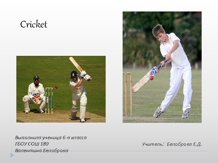 Cricket is a bat-and-ball game played between two teams of eleven players. It is played on a cricket field. There is a rectangular 22 -yard-long pitch with wickets (воротца)in the centre of the field. A bat and a ball A pitch and wickets