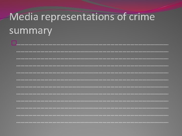 Crime and the Media �How does the concept of the media link in with crime: �We live in a media saturated society, �The media is obsessed with crime, �Crime is central theme of media output both fiction or non fiction, �Media is our main source of knowledge about crime.