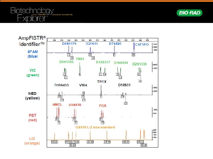 Real STR analysis Four different fluorescent tags have been used to identify 7 amplified loci Allele ladders are indicated by arrows