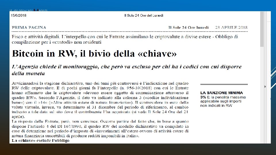 Non mancano però posizioni leggermente differenti sul punto da parte della dottrina. A tale ultimo riguardo, diventa importante la definizione di valuta virtuale, perché la soluzione dell’Agenzia poggia sull’assimilazione delle criptovalute alle valute estere. Assimilazione non sempre così scontata. Nel nostro ordinamento giuridico la valuta virtuale è comparsa per la prima volta in un testo normativo nell’aggiornamento del Dlgs 231/2007 nel contesto degli obblighi di prevenzione del rischio riciclaggio che incombono su intermediari (banche, assicurazioni eccetera) e professionisti. Qui il legislatore italiano, declinando le nuove regole sulla IV direttiva europea antiriciclaggio, ha preteso che nel momento in cui la valuta reale prende la via della criptovaluta – cioè al momento dell’acquisto di bitcoin – deve rimanere traccia reale di chi investe nell’algoritmo, cioè prima che si immerga nel mondo molto poco tracciabile delle catene digitali ad espansione continua, qual è la tecnologia delle blockchain. Nell’art. 1, comma 2, del D. Lgs. n. 90/2017, in attuazione della Direttiva UE 2015/849, si legge che la VALUTA VIRTUALE è “la rappresentazione digitale di valore, non emessa da una banca centrale o da un’autorità pubblica, non necessariamente collegata a una valuta avente corso legale, utilizzata come mezzo di scambio per l’acquisto di beni e servizi e trasferita, archiviata e negoziata elettronicamente”.